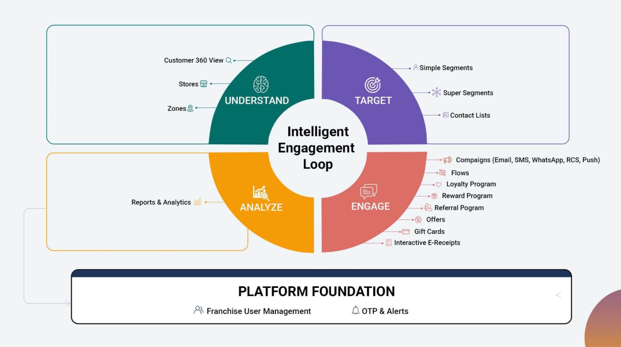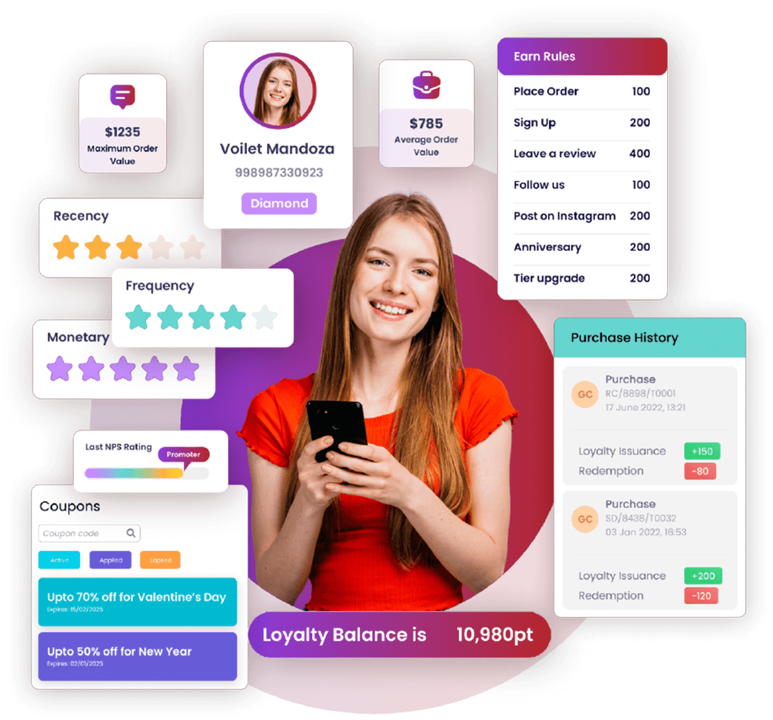 استخدم منصتنا لتعزيز استراتيجيتك التسويقية المتعددة القنوات في قطاعات البيع بالتجزئة، والبيع المباشر للمستهلك (D2C)، والمأكولات والمشروبات، والمطاعم، والتجارة الإلكترونية، بغية زيادة القيمة العمرية لعملائك إلى أقصى حد ممكن.